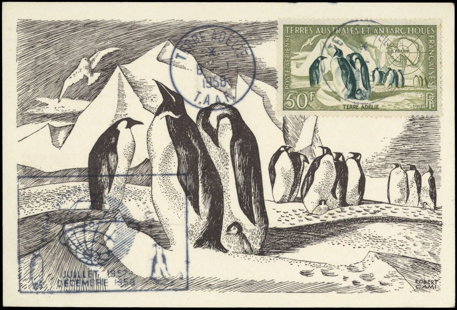 1956, 50 Fr. Kaiserpinguine auf dekorativer s/w- Maximumkarte und passendem Sonderstempel