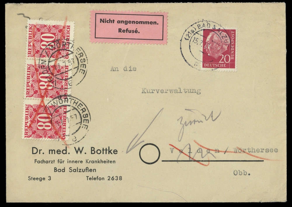 1957, 20 Pfg. Heuss auf Brief von BAD SALZUFLEN 15.7.1957, adressiert nach Velden / Österreich, rs. Ankunftsstempel, dort mit 3x 80 Gr. Portomarke frankiert und gestpl. "VELDEN 15.7.1957" und hds. Entwertung, ferner Aufkleber "Nicht angenommen.", leichte Beförderungsspuren.