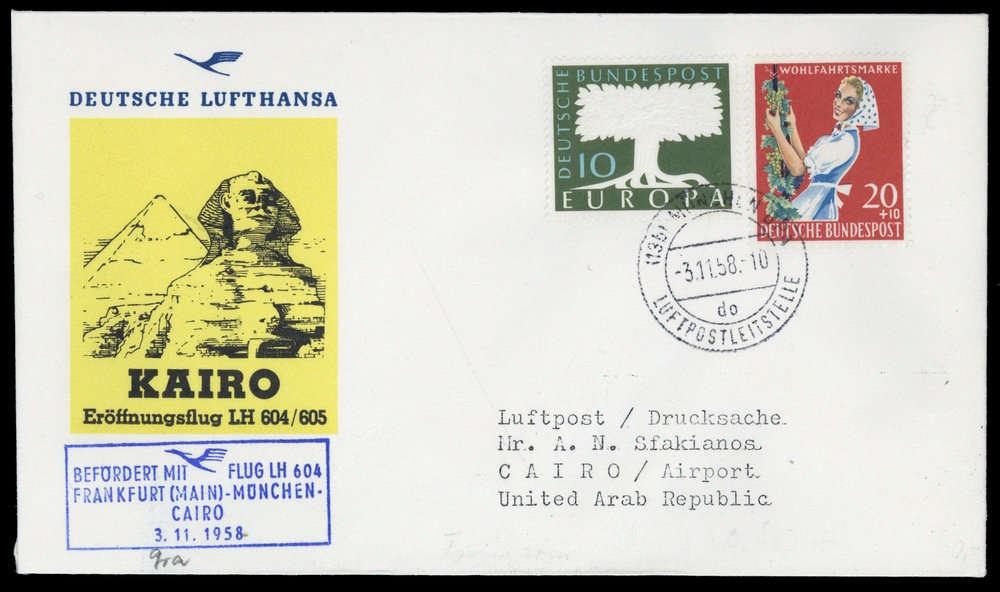 1958, ERSTFLUG DEUTSCHE LUFTHANSA München - Cairo auf passendem Schmuckkuvert mit Nr. 294 + 299 frankiert von MÜNCHEN-LUFTPOSTLEITSTELLE 3.11.1958, adressiert nach Cairo, blauer Sonderbestätigungsstempel, rs. Ankunftsstempel.