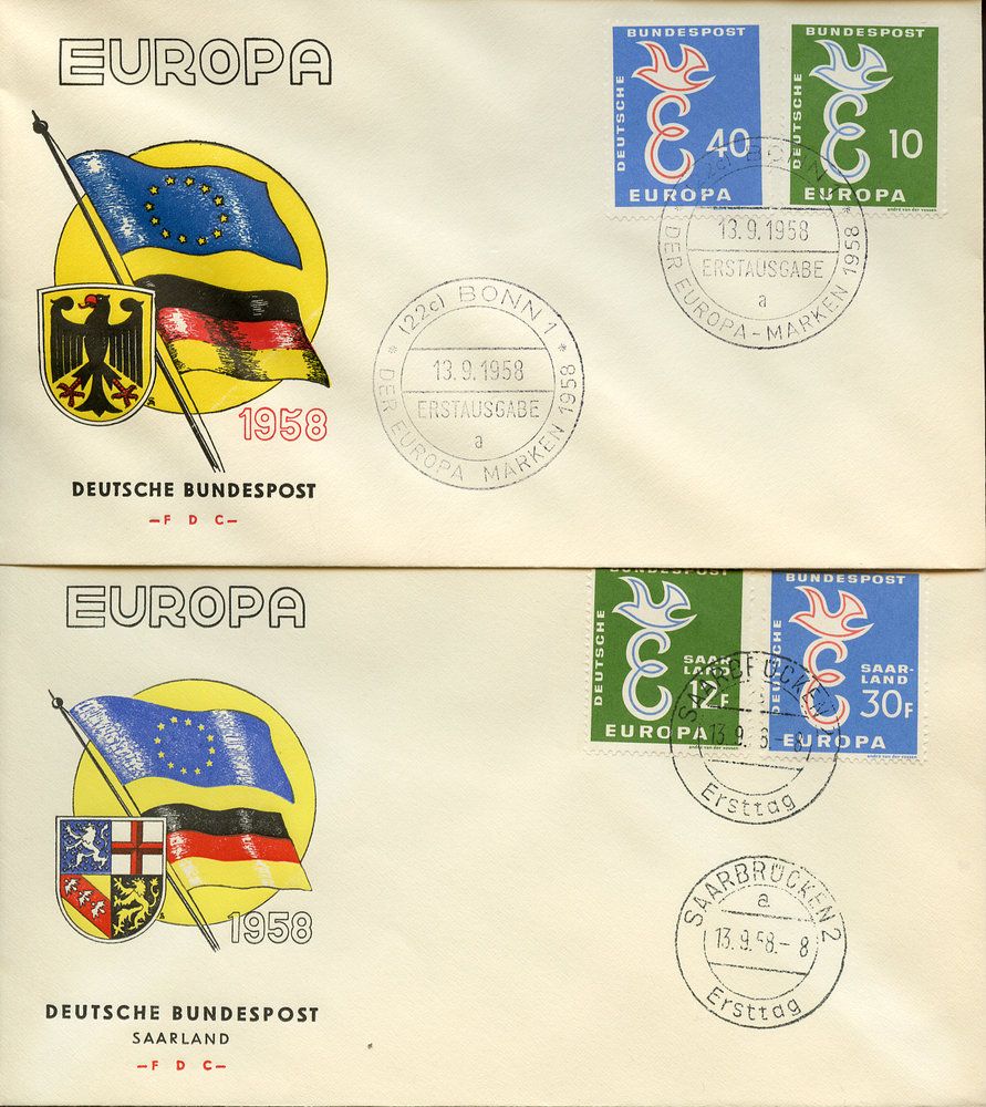 1958, Bundesrepublik und Saarland Europa-Cept je auf Ersttagsbrief