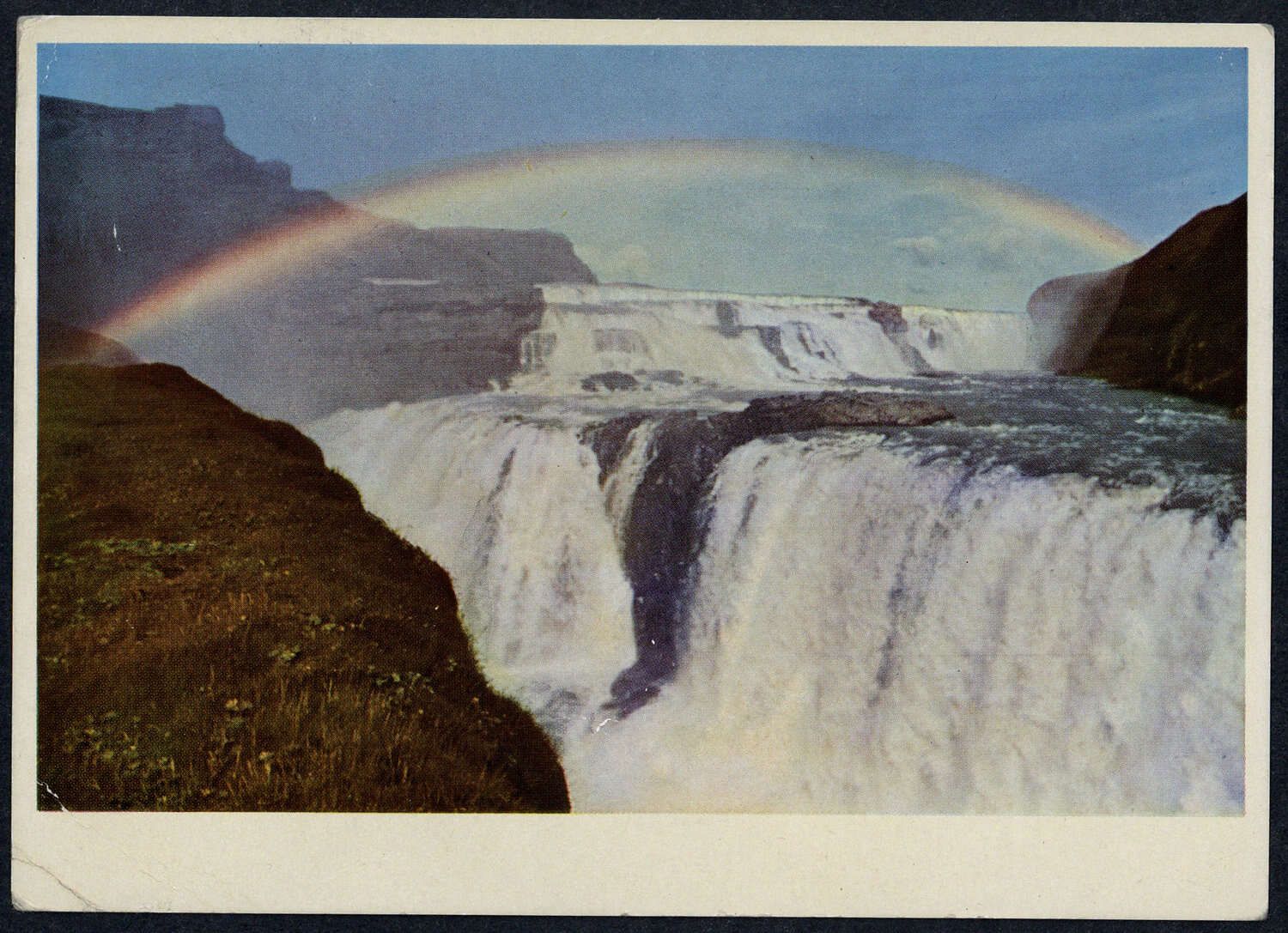 1958, 15 A und 2,45 Kr Elektrizität und Wasserfälle auf Auslands LP-Ansichtskarte "Gullfoss" vom 06.08.1958 von Reykjavik nach Pfronten, Beförderungsspuren.