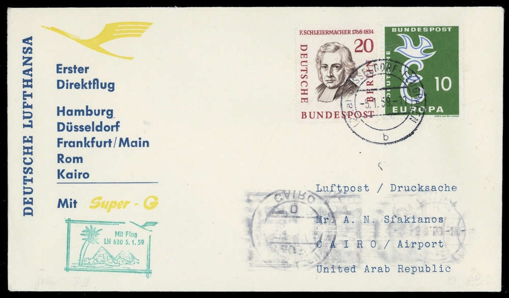 1959, ERSTFLUG DEUTSCHE LUFTHANSA Düsseldorf - Cairo auf passendem Schmuckkuvert mit Nr. 295 + BERLIN Nr. 167 frankiert von DÜSSELDORF-FLUGHAFEN 5.1.1959, adressiert nach Cairo, grüner Sonderbestätigungsstempel, rs. Ankunftsstempel, diese nach vorne durchschlagend.