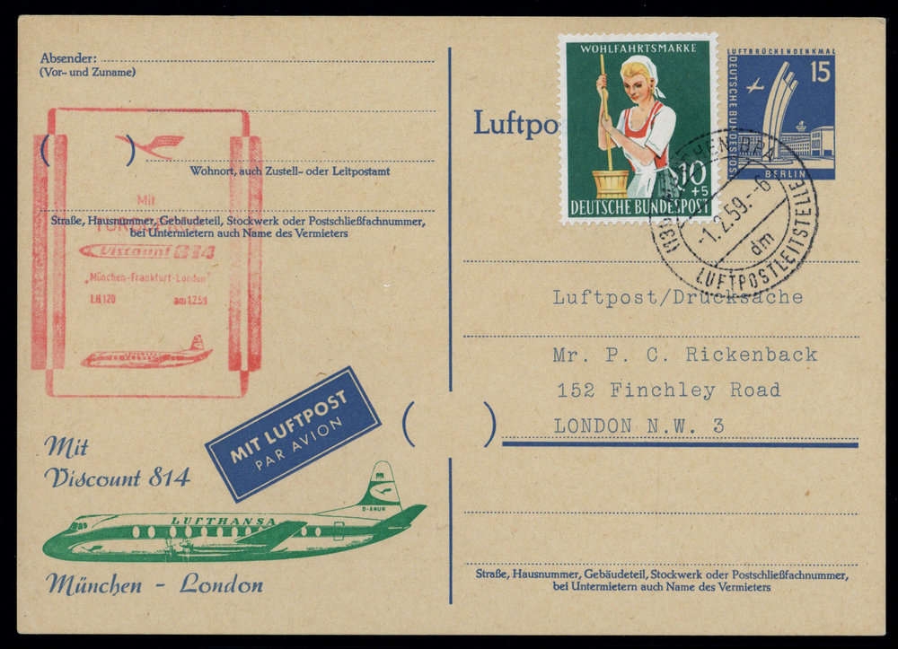 1959, ERSTFLUG DEUTSCHE LUFTHANSA München - London auf 15 Pfg. Berlin Luftpost-GA mit passendem Privatzudruck und Nr. 298 Zusatzfrankatur von MÜNCHEN-LUFTPOSTLEITSTELLE 1.2.1959, adressiert nach London, roter Sonderbestätigungsstempel, rs. Ankunftsstempel.