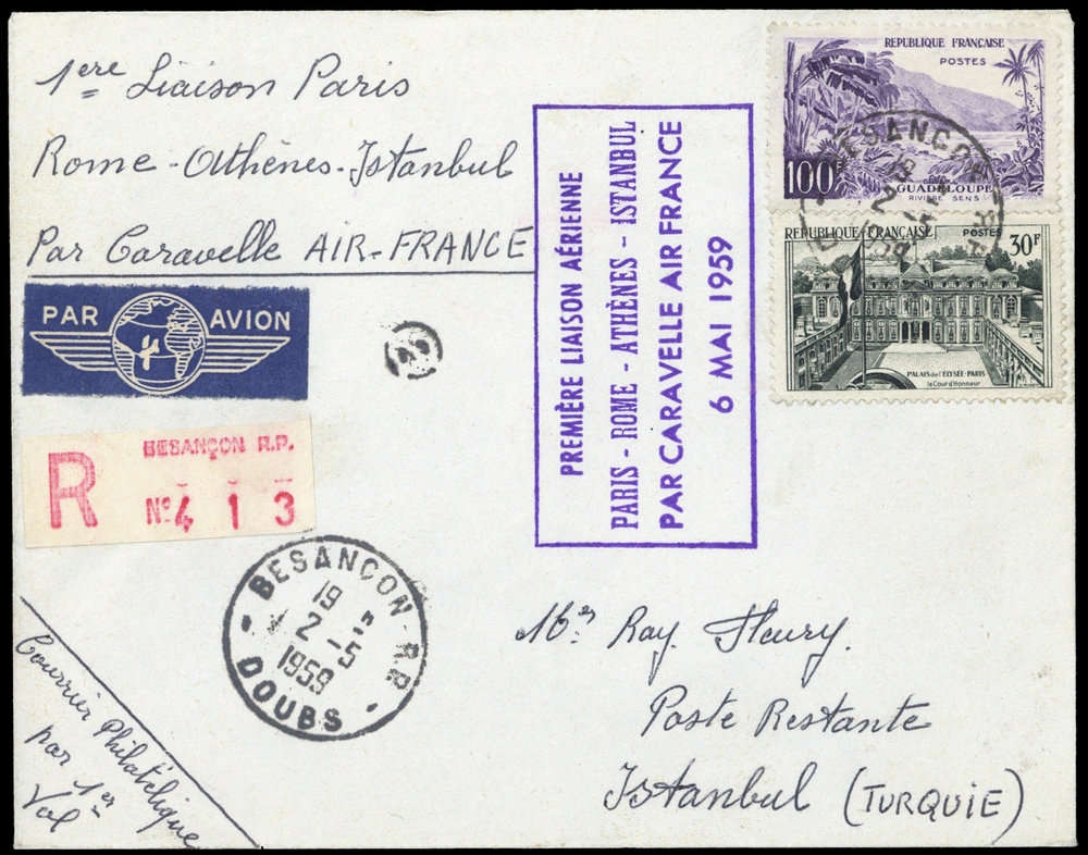 1959, ERSTFLUG PARIS - ISTANBUL auf Luftpost-R-Brief mit Nr. 1232 + 1234 (Eckfehler) frankiert von BESANCON 2.5.1959, adressiert nach Istanbul, violetter Sonderbestätigungsstpl., rückseitig Stempelvermerke