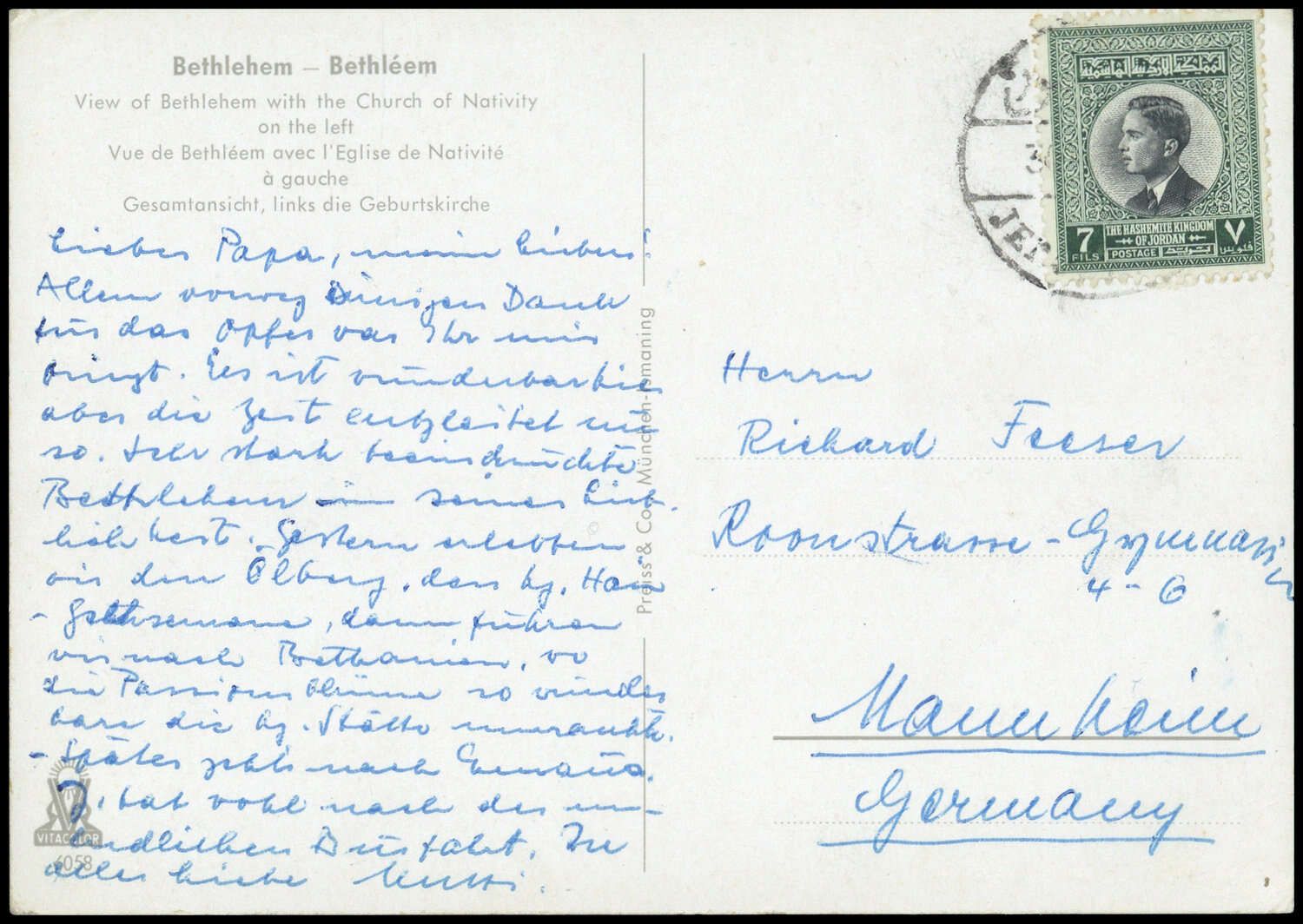 1959, 7 F Hussein II, DB "JERUSALEM 30 ...", farbige AK (Bethlehem, Gesamtansicht mit Geburtskirche), Beförderungsspuren, nach Mannheim