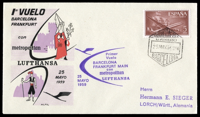 1959, LH-Erstflugbrief Barcelona-Frankfurt 25.5.59 mit Spanien-Frankatur