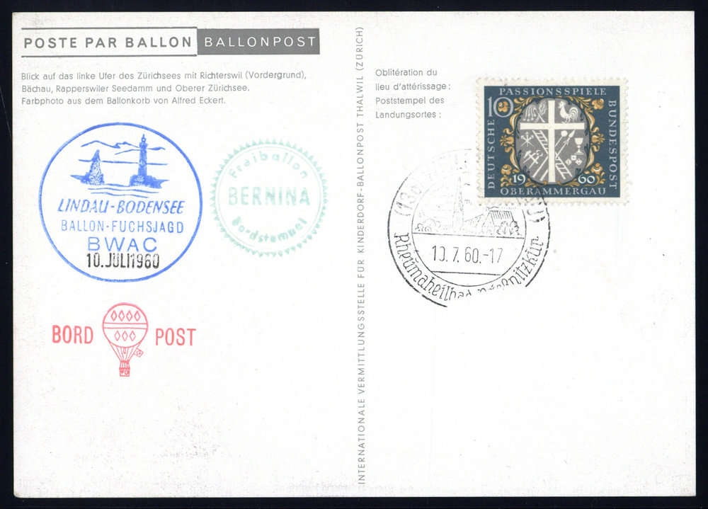 1960, farbige BALLON-Postsonderkarte mit Nr. 329 frankiert inkl. SST "WEILHEIM 10.7.1960", ferner weitere Ballon-Stempel u.a. "Lindau-Bodensee BALLON-FUCHSJAGD BWAC 10.7.1960", keine Empfängeradresse.