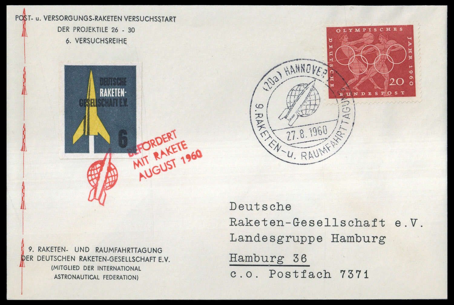 1960, 20 Pf Olympische Spiele auf Raketenpostbrief "Befördert mit Rakete August 1960" vom 27.08.1960 von Hannover mit Sonderstempel "9.Raketen und Raumfahrttagung" nach Hamburg mit Raketenvignette