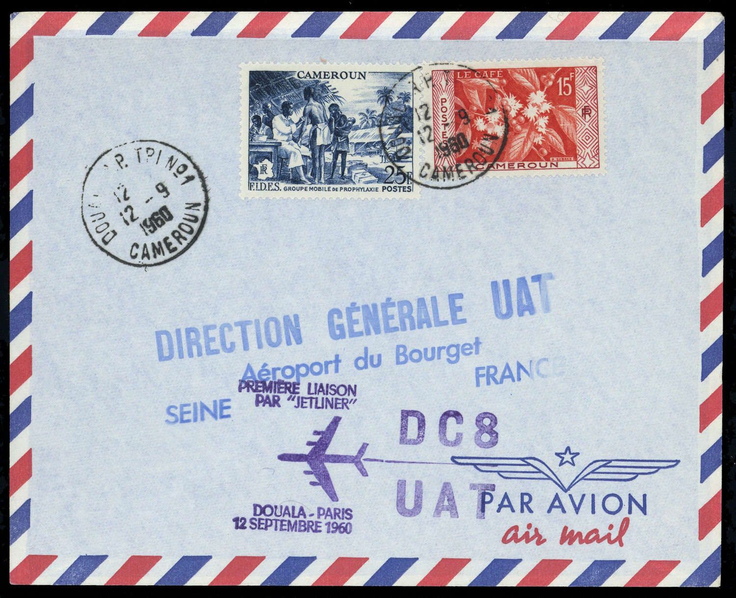 1960, 15 und 25 Fr Kaffee/Arztbehandlung, K1 "DOUALA 12-9 1960" auf Erstflugbrief "DUALA - PARIS DC 8", Ak "PARIS AVIATION 12-9-60"