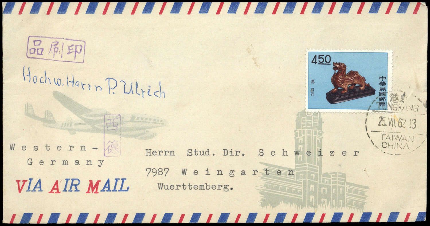 1961, 4.50 S Löwendrache, DB "TAIWAN 25.VII.62", EF auf Luftpostbrief, Beförderungsspuren, nach Weingarten/D