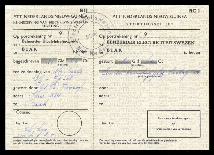 1962, vorgedruckter Zahlschein mit Stempel "Electriciteitswezen BIAK Ned.-Nw.-Guinea" über 21 Gld. 60 C.