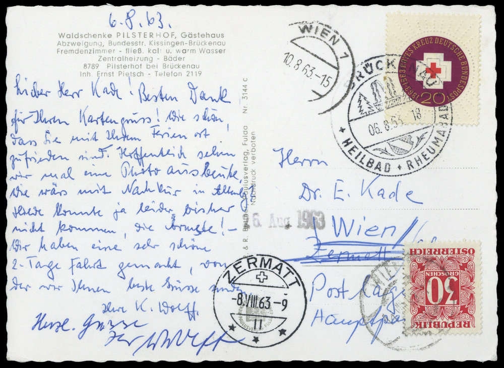 1963, 20 Pfg. Rotes Kreuz auf Postkarte mit SST "BRÜCKENAU 6.8.1963 HEILBAD", adressiert nach Zermatt / Schweiz mit Weiterleitung nach Wien / Österreich, Ankunftsstpl. "ZERMATT 8.8.1963" und 30 Schill. Österreich-Portomarke mit Stpl. "WIEN 10.8.1963"