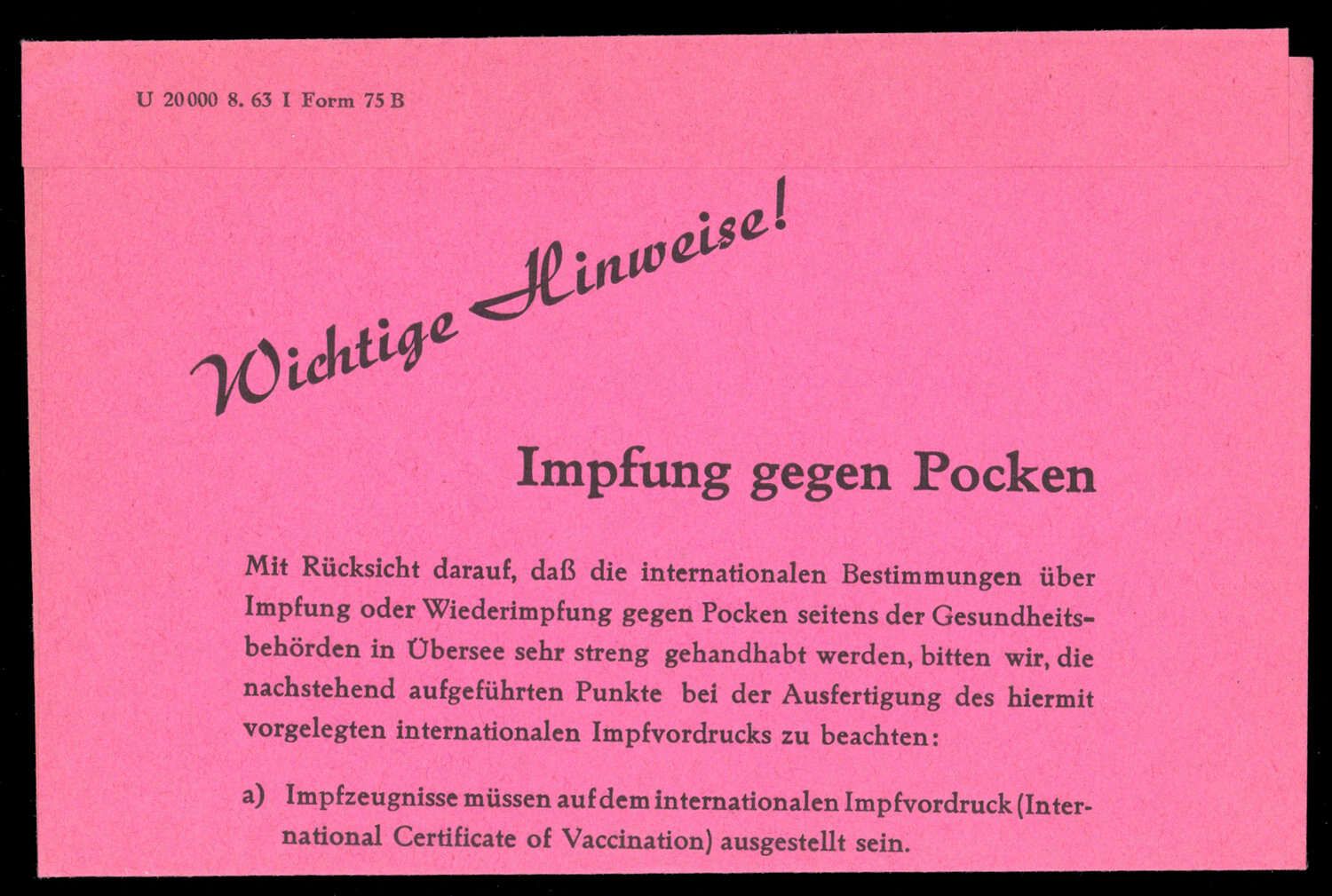 1963, rotes Faltblatt "Wichtiger Hinweis! Impfung gegen Pocken, Norddeutscher Lloyd Bremen" (U 20000 8.63 Form 75 b), Faltungen