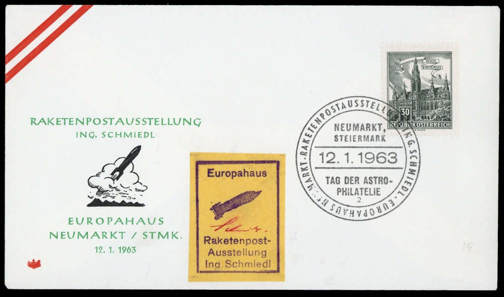 1963, 30 g Bauwerke auf Blanko Sonderumschlag vom 12.01.1963 von Neumarkt mit Sonderstempel "Raketenpostausstellung" und selbstgefertigtem Aufkleber zur Raketenpostausstellung mit Unterschrift Schmiedls