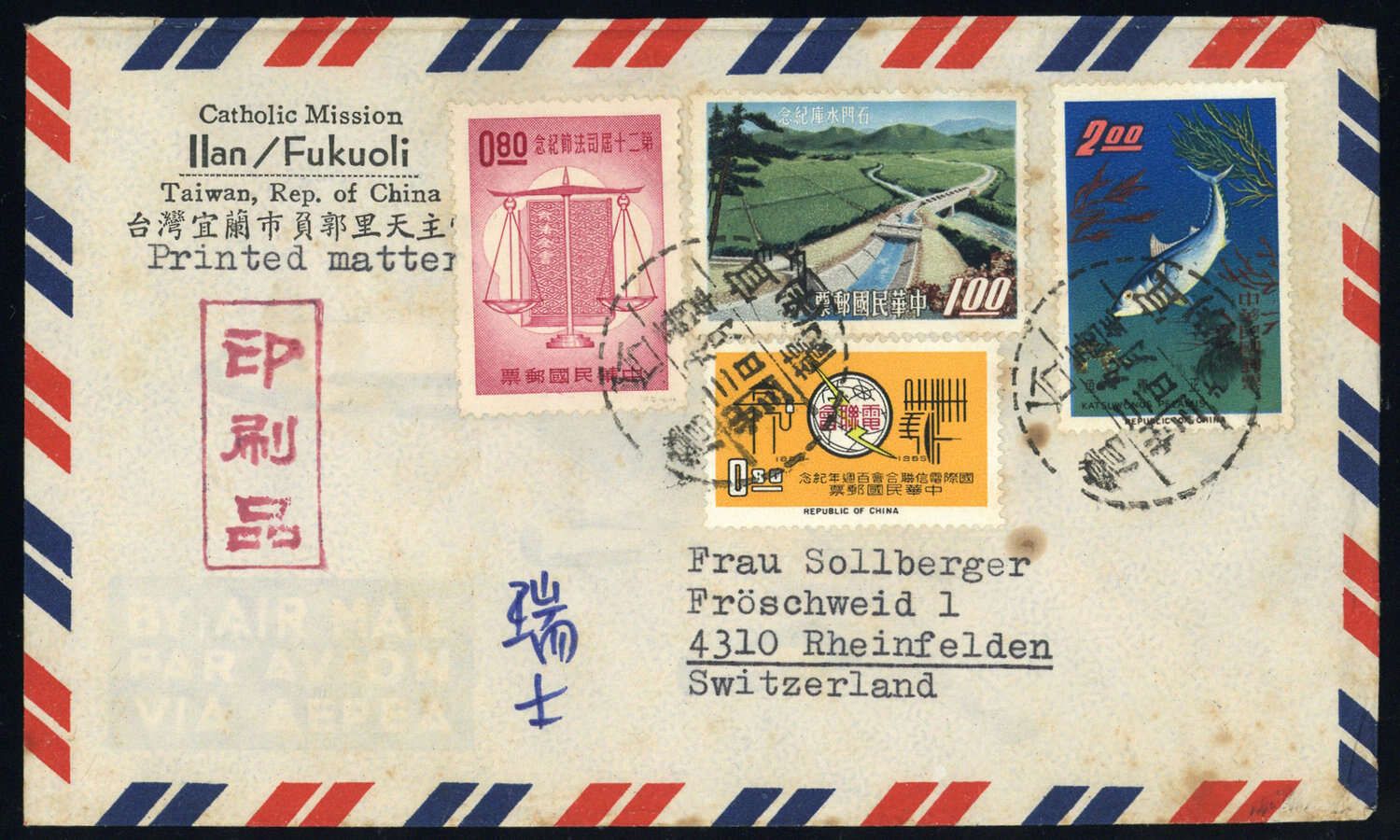 1964/65, 1 D Bewässerung, 3 Sondermarken Zusatz, DB von Taiwan, Luftpostbrief, Beförderungs- Altersspuren, nach Rheinfelden/CH