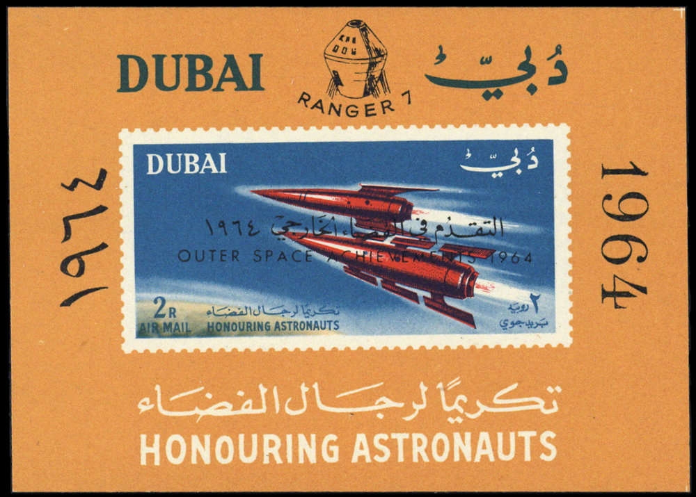 1964, Blockausgabe "Start der amerikanischen Mondsonde RANGER 7. BI. 14 mit Aufdruck OUTER SPACE ACHIEVEMENTS 1964" in Originalgröße postfrisch