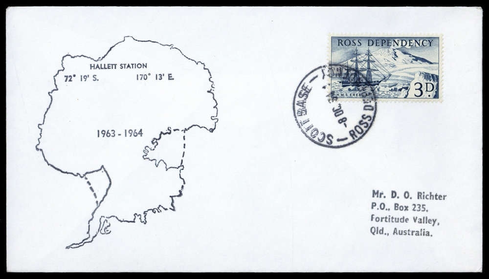 1964, 3 P. Erebus auf phil. Schmuckumschlag "Hallett Station" mit K1 "Scott Base 8 Oc. 64 Ross Dependency"