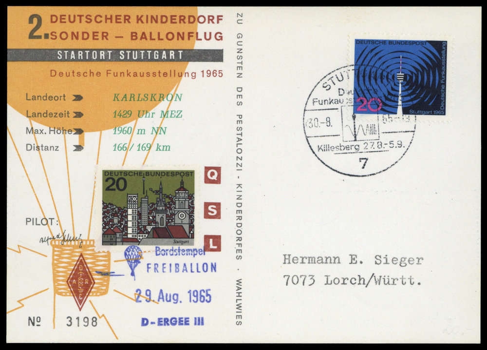 1965, 2. Deutscher Kinderdorf - Sonder-Ballonflug auf farbiger Sonderkarte mit Nr. 481 frankiert inkl. SST "STUTTGART 30.8.1965", adressiert nach Lorch, ferner Nr. 426 mit blauem Bordstempel "D-ERGEE III" entwertet.
