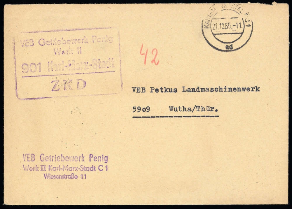 1965, ZKD-Brief (VEB Getriebewerk Penig / Werk II Karl-Marx-Stadt C1) von KARL-MARX-STADT 21.12.1965 nach Wutha / Thüringen, violetter ZKD-Stpl., rs. Stpl. "Eisenach + Wutha", leichte Spuren.