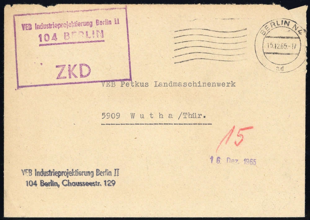 1965, ZKD-Brief (VEB Industrieprojektierung Berlin II) mit Rollenstpl. "BERLIN N4 15.12.1965" nach Wutha, rs. Stempel "EISENACH + WUTHA", violetter ZKD-Stpl., oben leichte Öffnungsmängel.