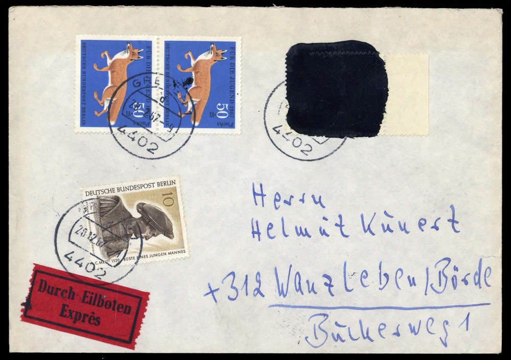1967, 20 Pfg. Vertreibung, Randstück "SCHWARZ ÜBERMALT" mit BERLIN Nr. 302 (2x) + 303 zusammen auf Eilboten-Brief von GREVEN 28.12.67 nach Wanzleben / DDR, rs. Ankunftsstpl., Kuvert leichte Rand- und Alterungsspuren.