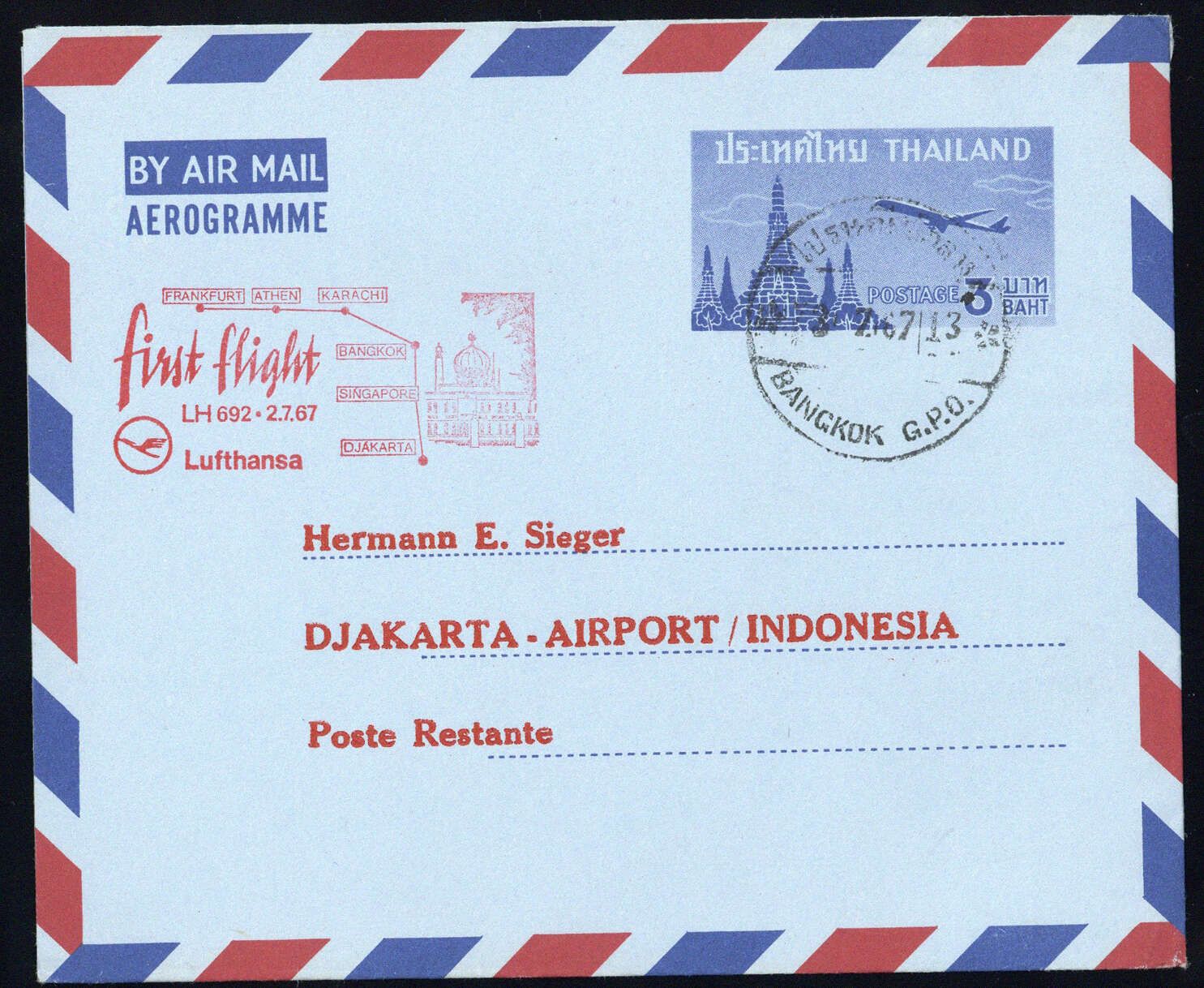 1967, 3 B blau, LH 692 Erstflugbrief 2.7.67, LF Flugzeug, Etappe K1 "BANGKOK G.P.O.3.7.67", rs. Ak "DJAKARTA 3-7-1967"