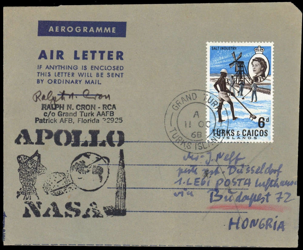 1967, 6 P Salzgewinnung, K2 "GRAND TURK 11 OC 68", auf Aerogramm, Neben-SST "APOLLO NASA", rs. Flug-Ankunft-K2 "BUDAPEST 68 X 26"