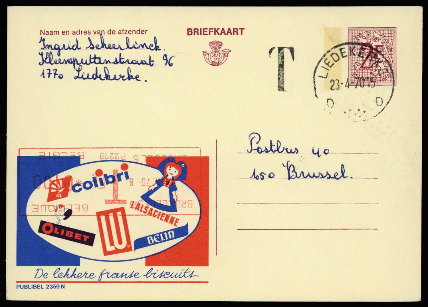 1970, 2 Fr Schreitender Löwe - Werbepostkarte "LU Kekse" vom 23.04.1970 von Liedekerke nach Brüssel mit T Stempel