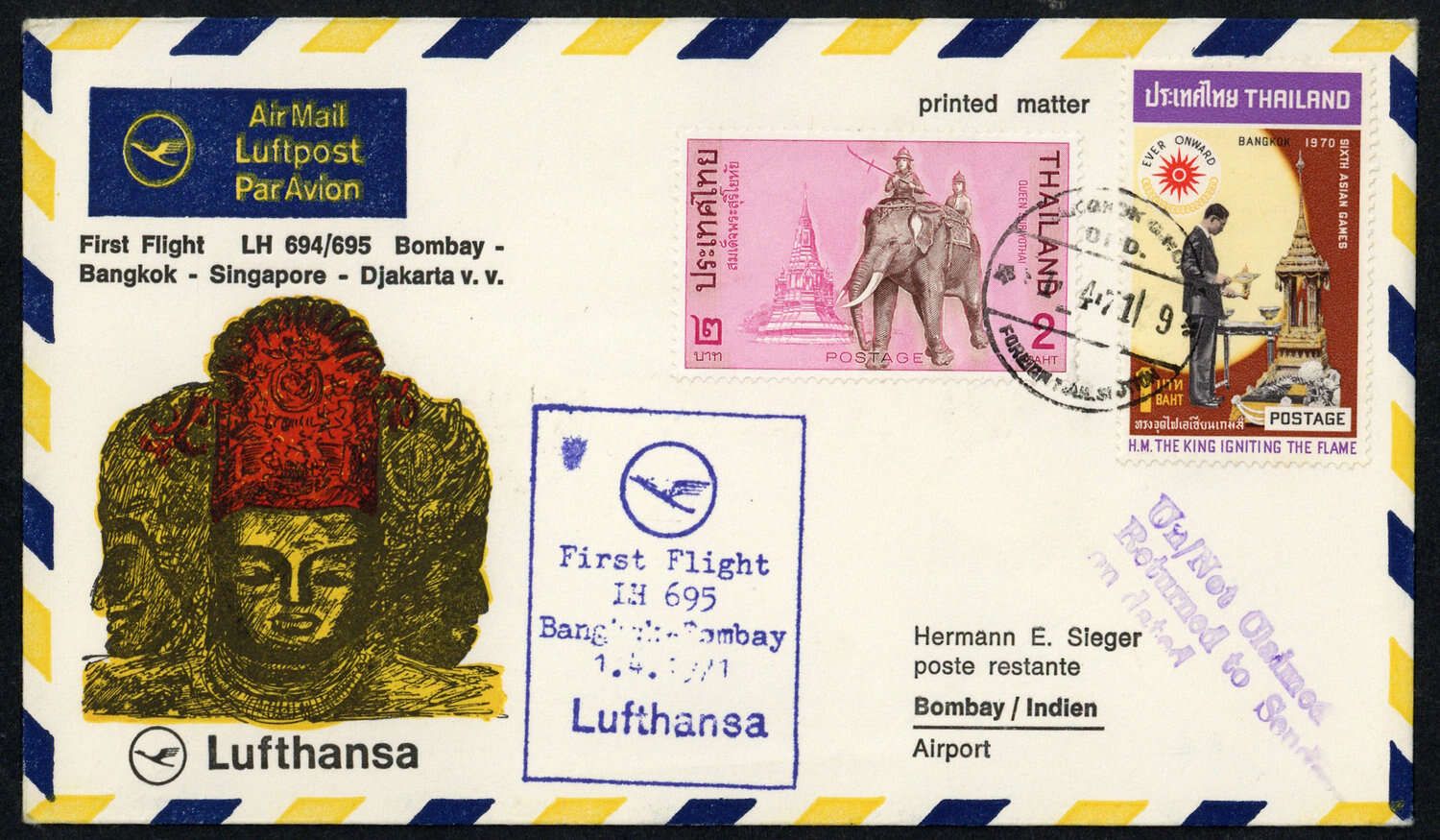 1971, Lufthansa-Erstflugbrief Bangkok-Bombay 1.4.71 mit zwei Werten