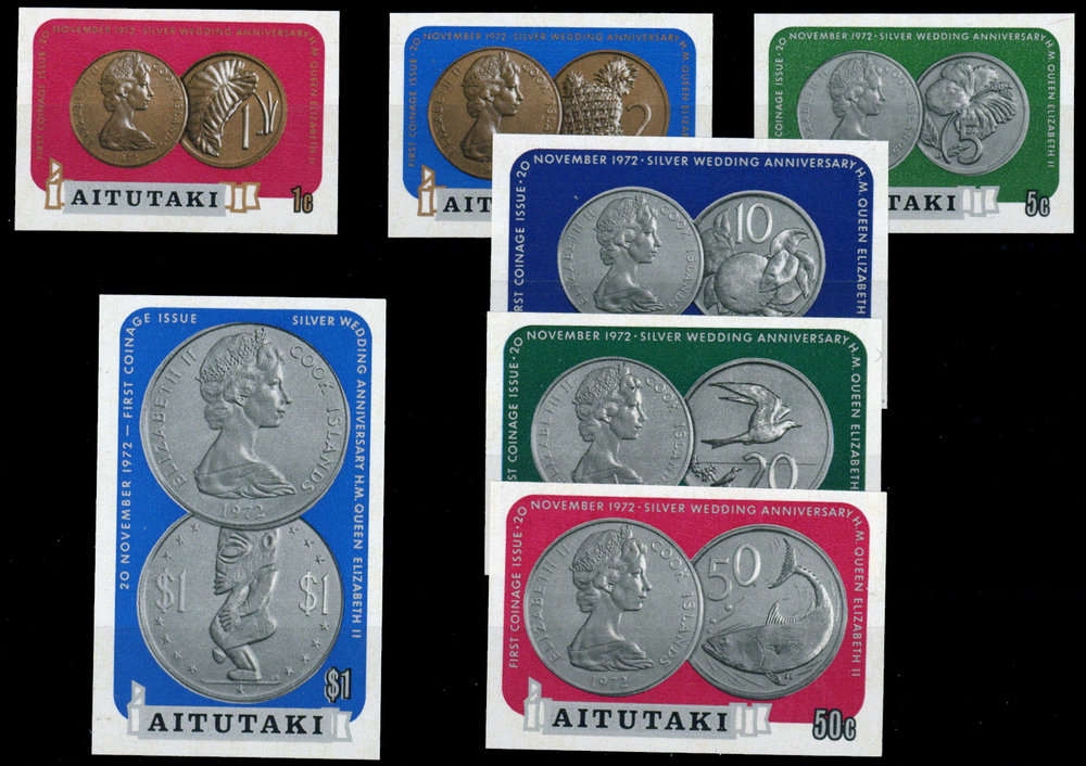 1973, 7 Werte Kursmünzen der Cook-Inseln postfrisch als seltene ungezähnte Variante!
