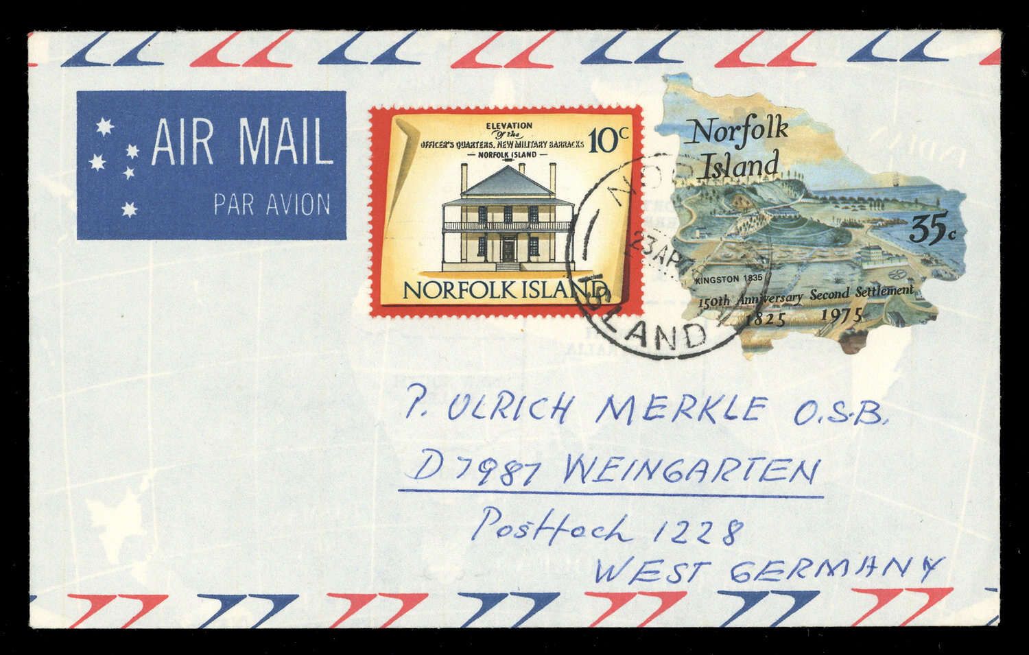 1973/75, 35 C Landkarte mit 10 C Offiziersgebäude, K1 "NORFOLK 23 AP 76", Luftpostbrief nach Weingarten/D