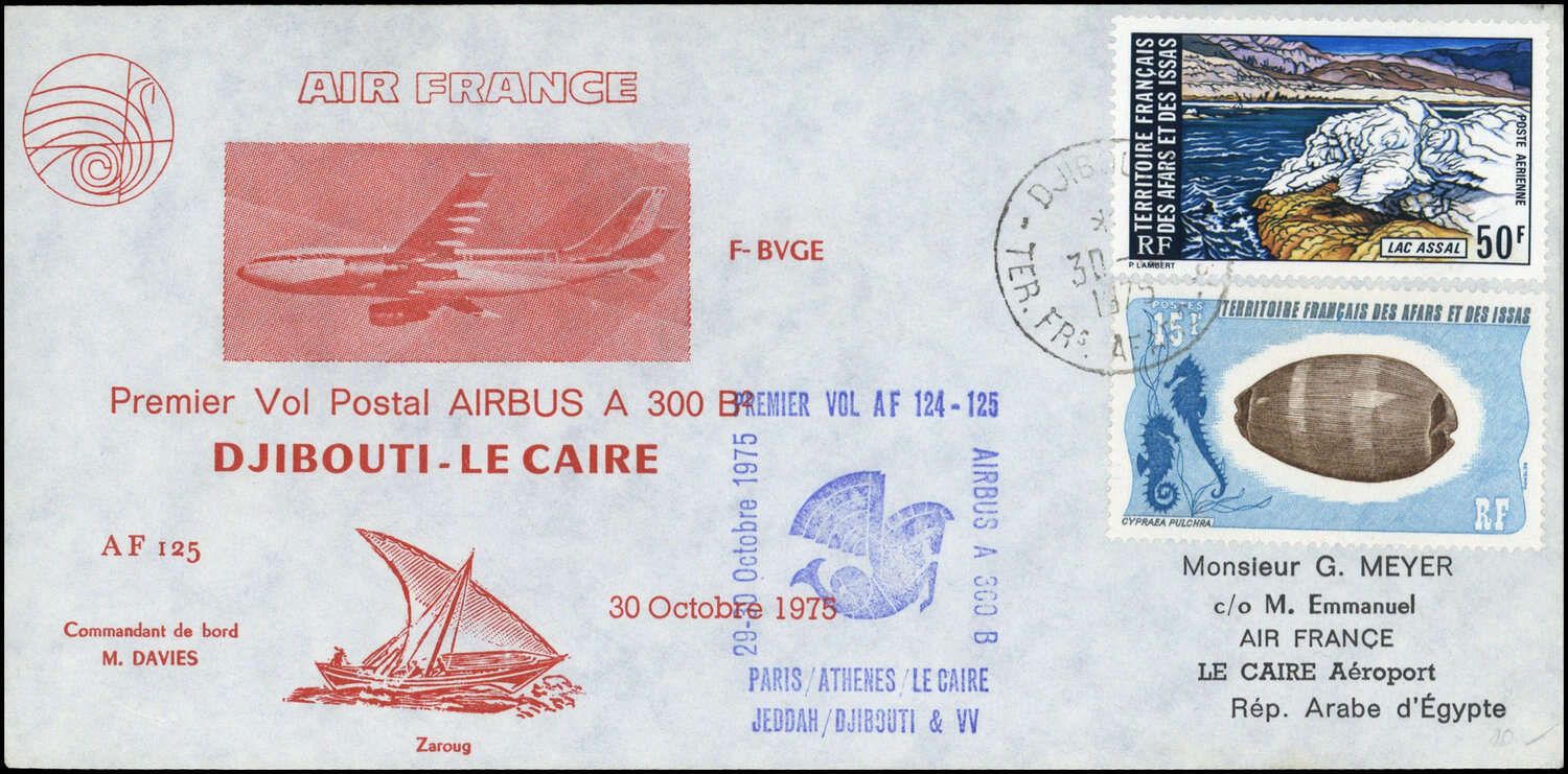 1975, Airfrance Airbus A 300 Erstflug "DJIBOUTI 30-10 1975 - CAIRO", 2 Marken auf illustriertem Umschlag, rs. Ak-K1 "CAIRO 2 NO 75"