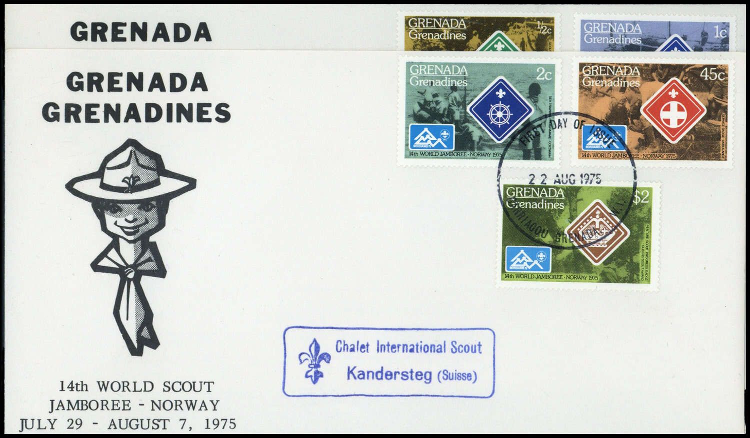 1975, Pfadfinder auf zwei Schmuck-FDCs mit EST Carriacou und Nebenstempel "Chalet International Scout Kandersteg (Suisse)"
