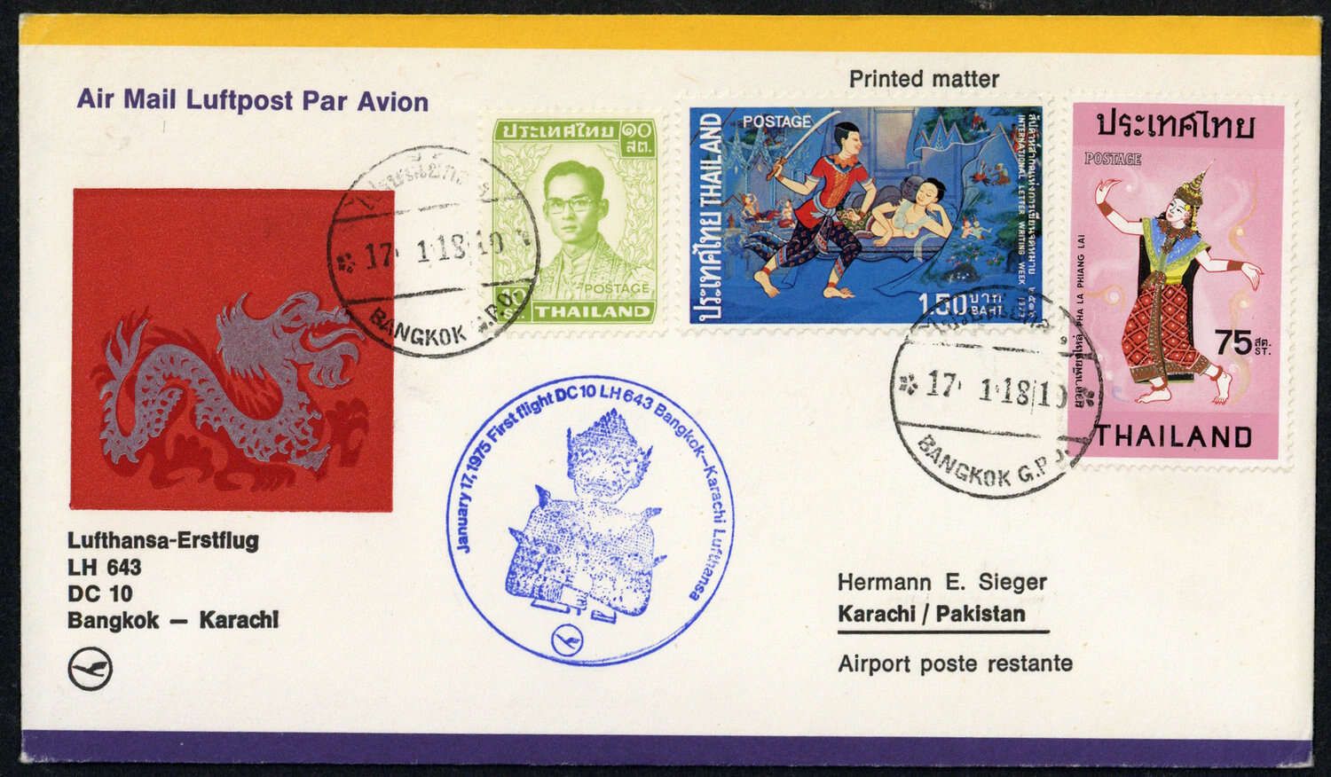 1975, Lufthansa-Erstflugbrief Bangkok-Karachi 17.1.75 mit drei Werten