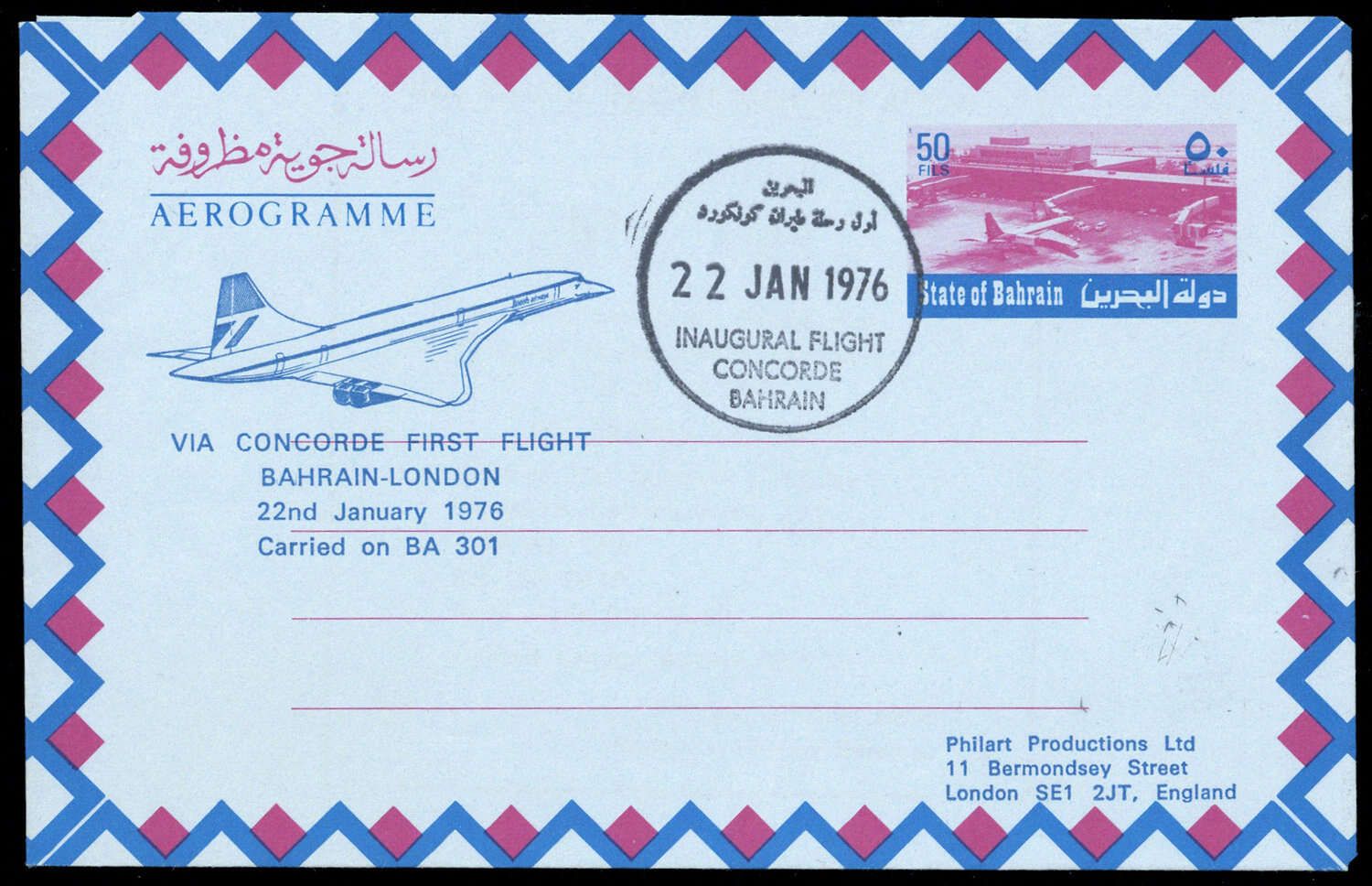 1976, "BAHRAIN - LONDON Inaugural Flight CONCORDE 22 JAN 1976", K1 auf 50 F Aerogramm (Flughafen), befördert mit BA 301, nach London adressiert