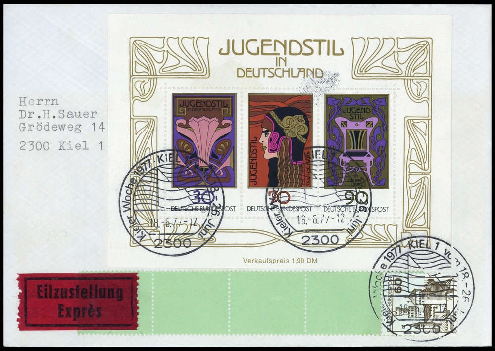 1977, 60 Pfg. Burgen & Schlösser als ROLLEN-Endstreifen (4 grüne Leerfelder) und Bl.14 zusammen auf Eilboten-Brief (Eilboten-Zettel über Leerfelder frankiert) mit SST "KIEL 18.6.77 - KIELER WOCHE" nach Kiel, rs. Stempel, leichte Spuren.