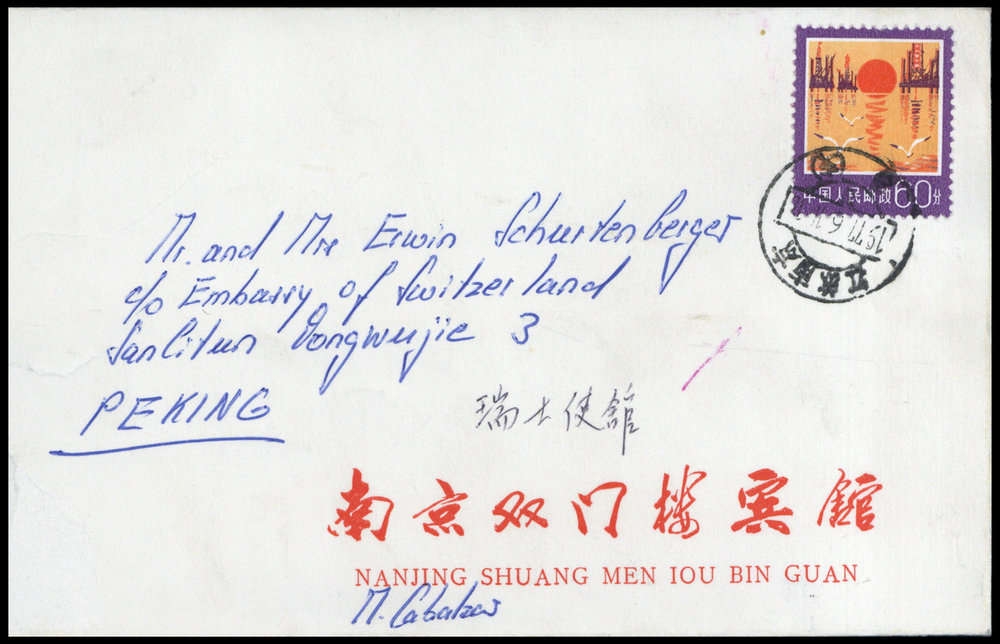 1977, 60 F Erdölfelder, Inlandsbrief, links Öffnungsspuren aus Nanking "1977.6.1(0)", an die "Embassy of Switzerland" in Peking, Beförderungsspuren