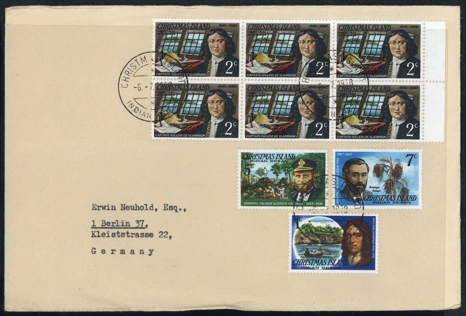 1977, 1, 2 (6) C, sowie 5 und 7 C Besucher auf Brief mit K1 "CHRISTMAS ISLAND 6.7.1978" auf Brief nach Berlin