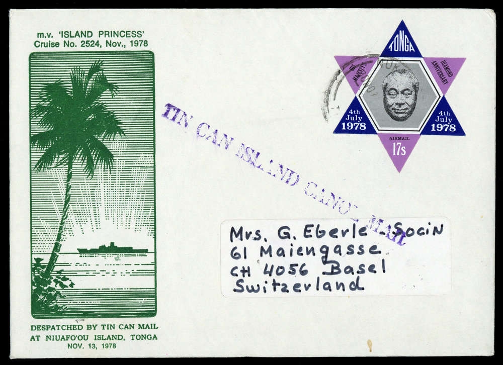 1978, 17 C Geburtstag König-Flugpost, Schmuckumschlag , K2 "NIUAFOOU 30 NOV (81)", Neben-L1 "TIN CAN ISLAND CANOE MAIL", Beförderungsspuren, nach Basel