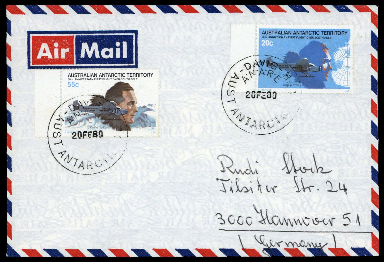 1979, 20 und 55 C Admiral Byrd, K1 "DAVIS A.N.A.R.E./A.A.T. 20 FE 80", Luftpostbrief nach Hannover