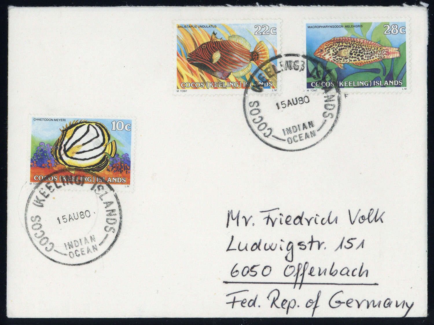 1979/80, 10, 22 und 28 C Fische, K1 "COCOS ISLANDS 15 AU 80", Brief nach Offenbach
