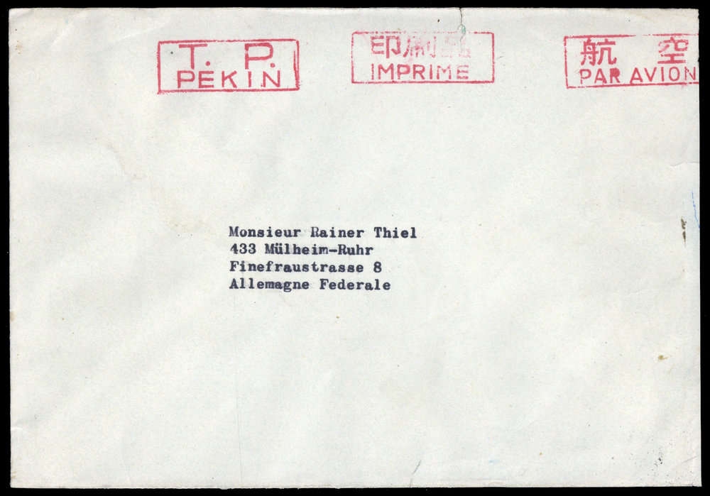 1980, ca., 3 rote Ra2: "T.P. PEKIN", ".. IMPRIME" und ".. PAR AVION", Brief Beförderungs- Altersspuren, Briefrandmängel, nach Mülheim-Ruhr