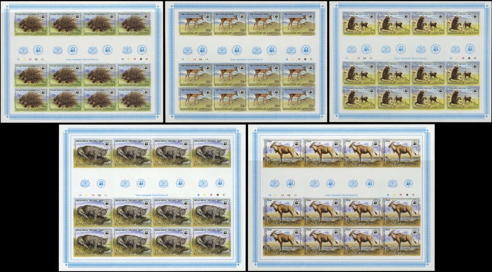 1981, 5 Werte WWF "Bedrohte Tiere" als außergewöhnlicher postfrischer ungezähnter Kleinbogen- Satz zu 5 Kleinbögen mit insgesamt 12 ungezähnten Sätzen. Hiervon insgesamt 4 senkrechte ungezähnte Zwischenstegpaar- Sätze