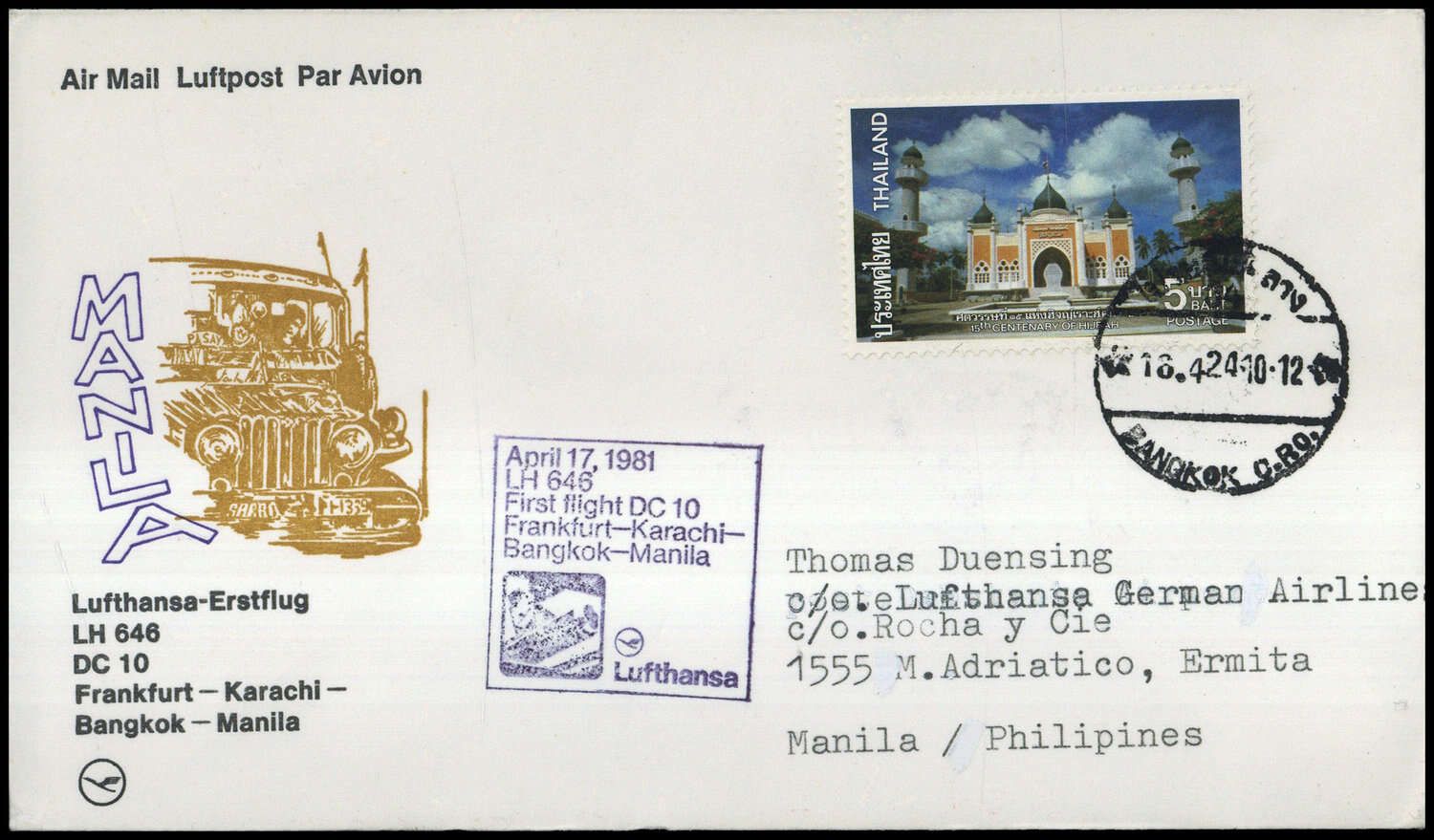 1981, LH 646 Erstflug "BANGKOK 18.4.2410 - MANILA" Brief mit Bestätigungsstempel (April 17, 1981 aus Frankfurt) , rs. Ak-K1 "MANILA APR 19 1981", Beförderungsspuren