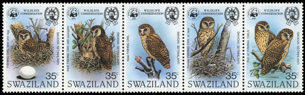1982, 5 Werte WWF "Afrikanische Fischeule" als postfrischer Zusammendruck 5-er Streifen