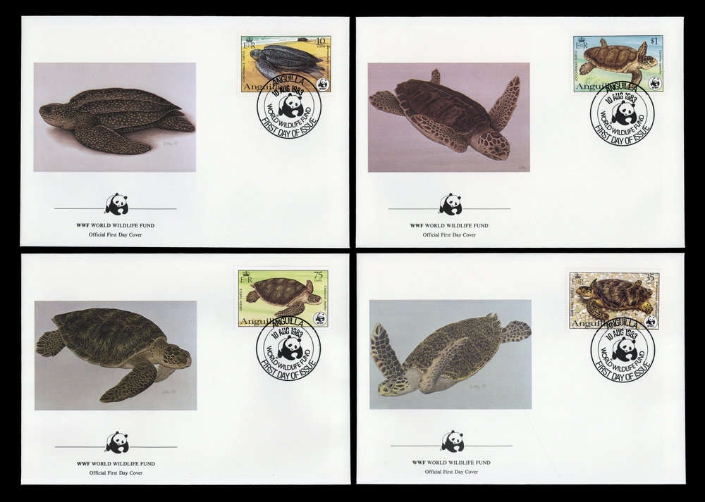 1983, 4 Werte Schildkröten aus Anguilla jeweils auf attraktivem WWF Ersttagsbrief, mit Lederschildkröte, Echte Karettschildkröte, Suppenschildkröte und Unechte Karettschildkröte, Auflage nur 200.000