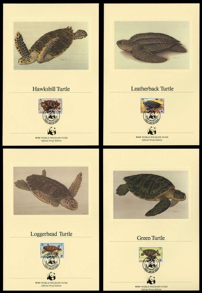1983, 4 Werte Schildkröten aus Anguilla mit Lederschildkröte, Echter Karettschildkröte, Suppenschildkröte und Unechter Karettschildkröte als kompletter WWF Satz jeweils auf dekorativem und offiziellem WWF-Kunstdruck im EU Format 180x265 mm mit Tierbild von dem Künstler Urs Woy/Schweiz, zusätzlich auf dem Blatt den Namen des Tieres auf Englisch und passendem Ersttagsstempel sowie das offizielle Panda-Symbol im Goldprägedruck
