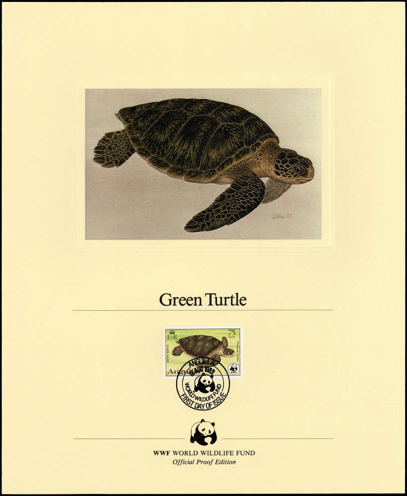 1983, 75 C. Suppenschildkröte aus Anguilla als dekorativer und offizieller WWF-Kunstdruck im USA Format 239x292 mm mit Tierbild von dem Künstler Urs Woy/Schweiz, zusätzlich auf dem Blatt den Namen des Tieres auf Englisch und passendem Ersttagsstempel sowie das offizielle Panda-Symbol im Goldprägedruck