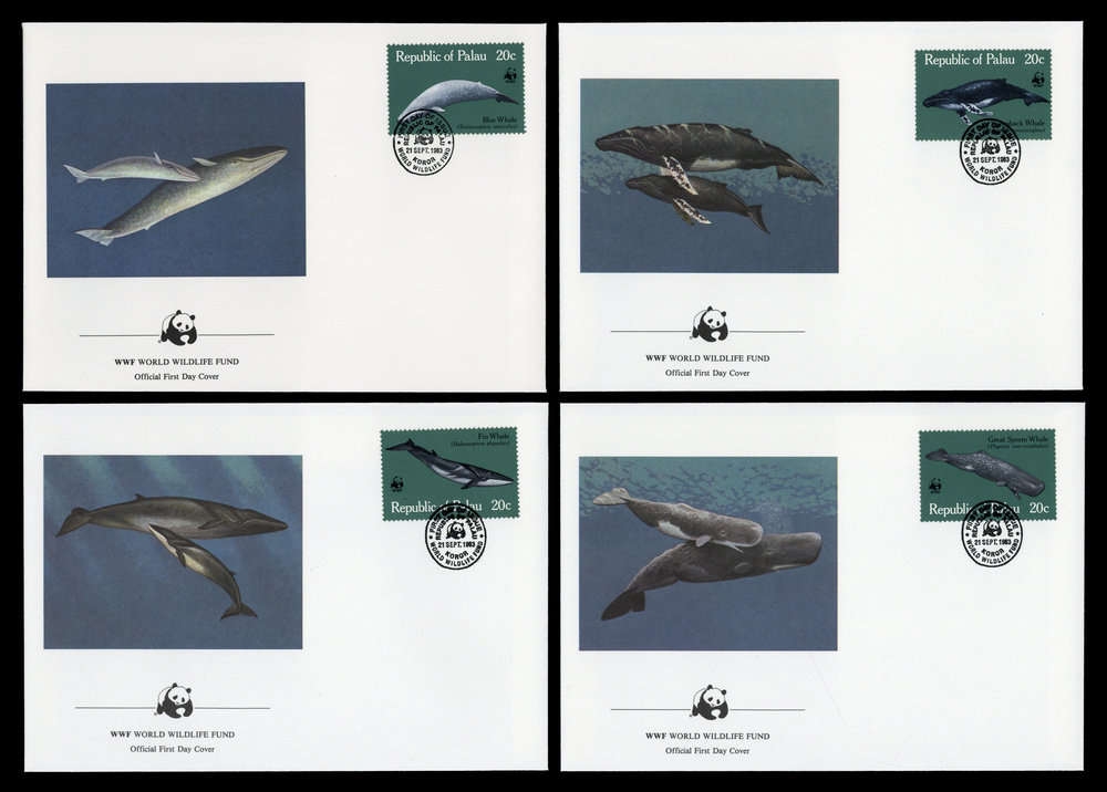 1983, 4 Werte Wale von den Palau Inseln jeweils auf attraktivem WWF Ersttagsbrief, mit Buckelwal, Blauwal, Finnwal und Pottwal