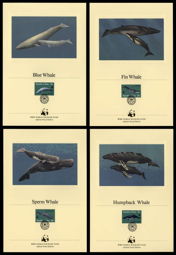 1983, 4 Werte Wale von den Palau Inseln mit Buckelwal, Blauwal, Finnwal und Pottwal als kompletter WWF Satz jeweils auf dekorativem und offiziellem WWF-Kunstdruck im EU Format 180x265 mm mit Tierbild von dem Künstler Richard Ellis/USA, zusätzlich auf dem Blatt den Namen des Tieres auf Englisch und passendem Ersttagsstempel sowie das offizielle Panda-Symbol im Goldprägedruck